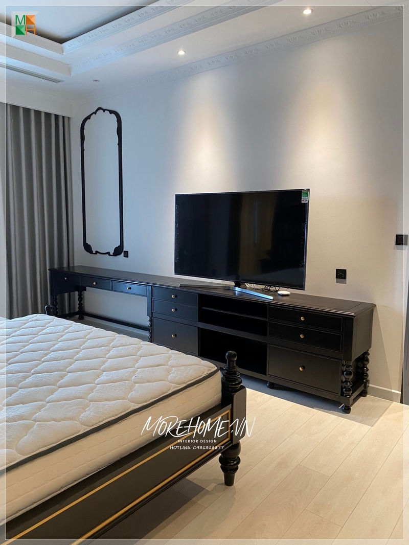 Morehome đã thực hiện hình ảnh công trình thi công giường ngủ gỗ tự nhiên tân cổ điển với phun sơn màu trắng đẹp.